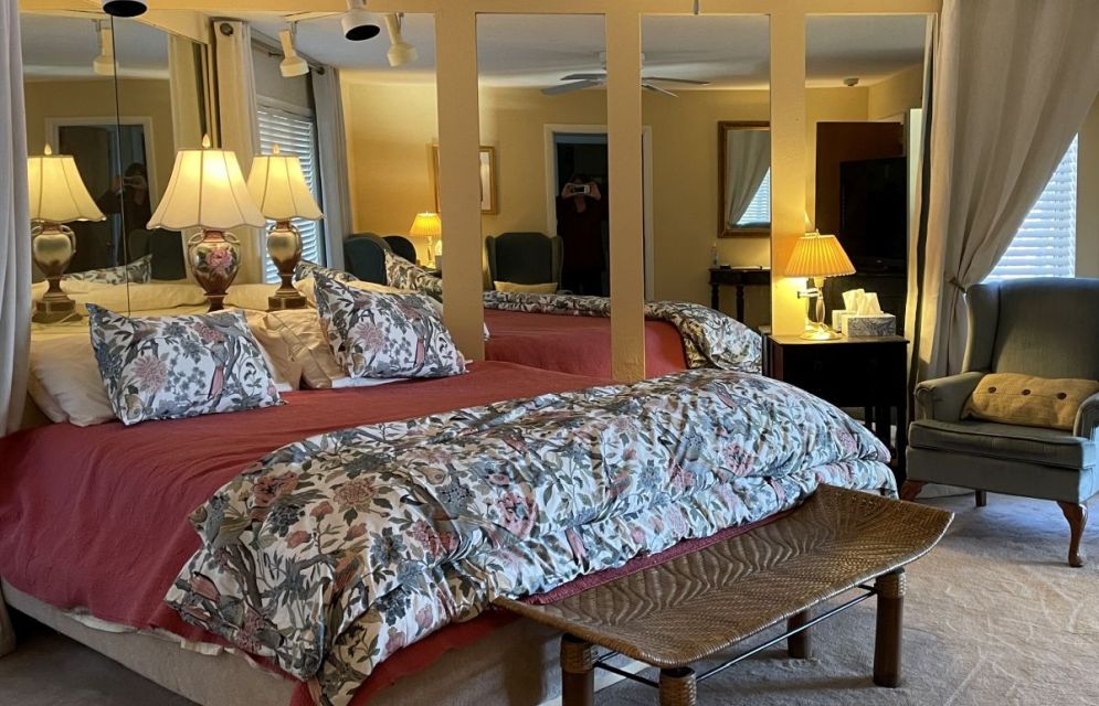 This serene king-size bedroom suite has a sitting room with a luxurious queen-size sleeper sofa. The sitting room doors can be closed off and used as a separate bedroom that would share the suites’ bath. Best of all, the sitting room has a private porch that overlooks the river. It’s great for that early morning coffee/newspaper time.